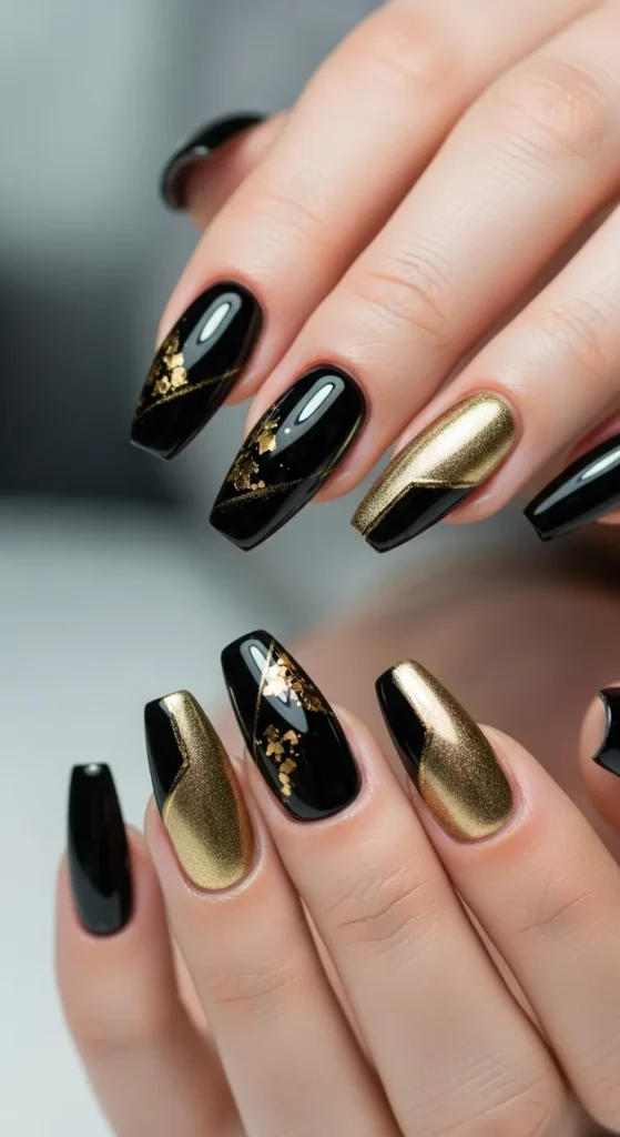 A perfect combo of mystery and luxury — matte black nails with gold accents look elegant and bold.