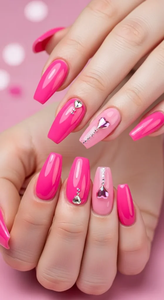 Hot pink, glossy shine, and a bit of sparkle — channel your inner Barbie with this trendy style.