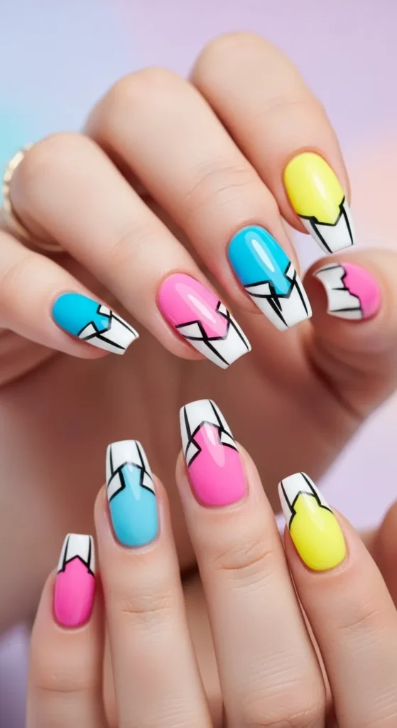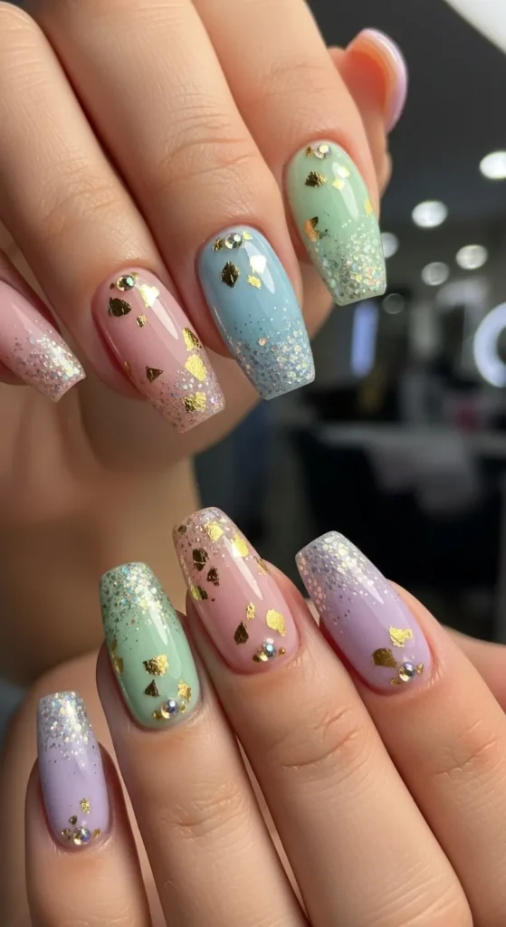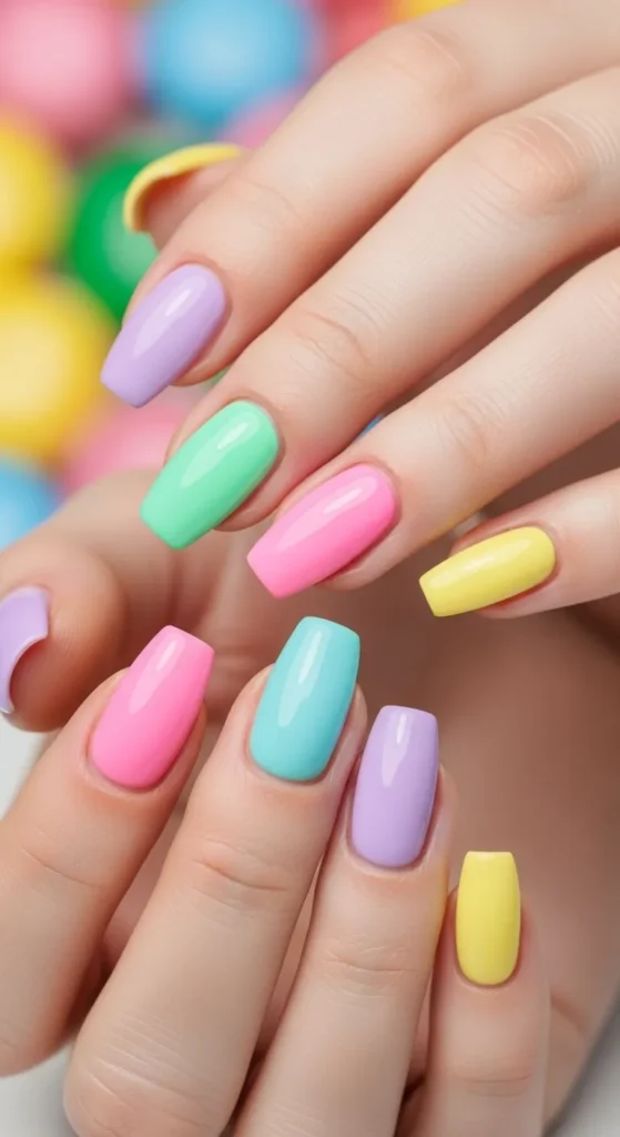 Soft candy shades — pink, mint, lilac — create a youthful, sweet vibe.