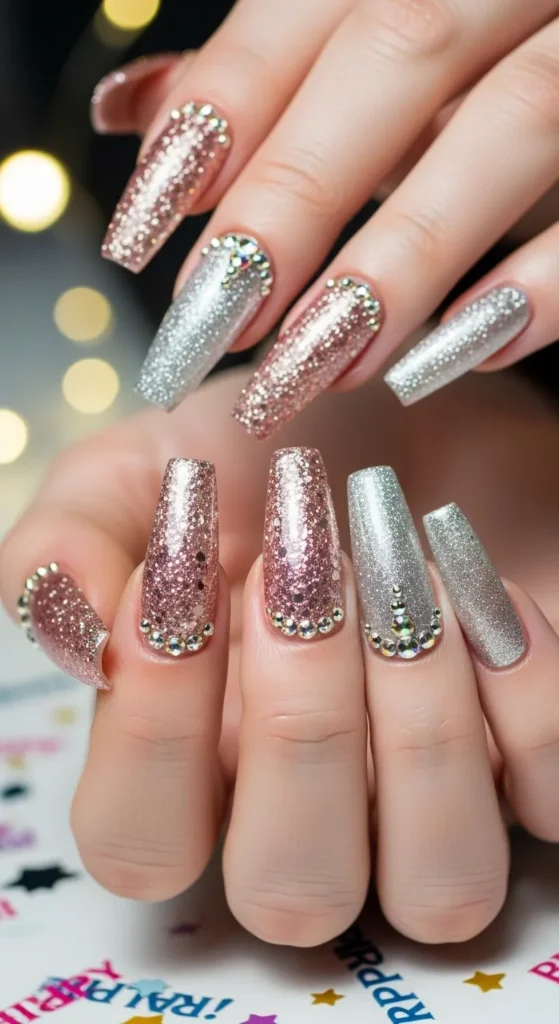 The biggest birthday nail trend of 2025 is “chrome meets sparkle” — a mix of metallic finishes with glitter or gemstones. Other trending looks include ombre gradients, rhinestone tips, and 3D nail accents.