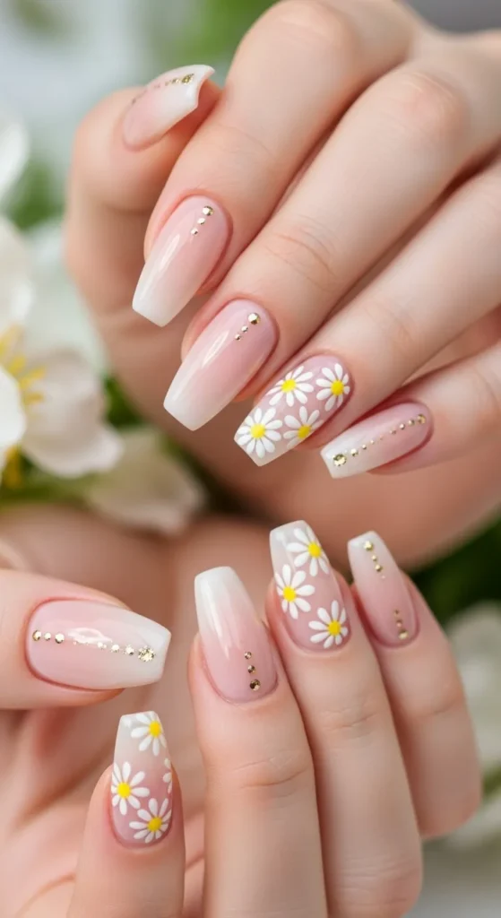 White daisies on baby blue or nude polish — fresh, fun, and always in trend.