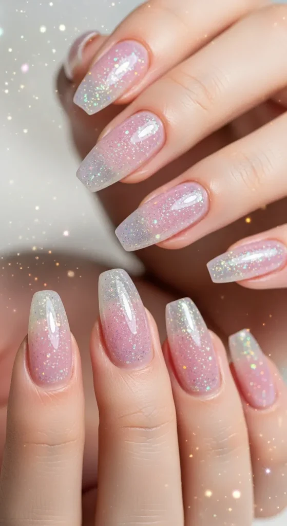 A sheer base with iridescent glitter — magical and delicate like fairy wings.