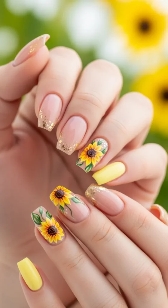 Bright yellow sunflowers painted on nude or pastel bases bring warmth and positivity.