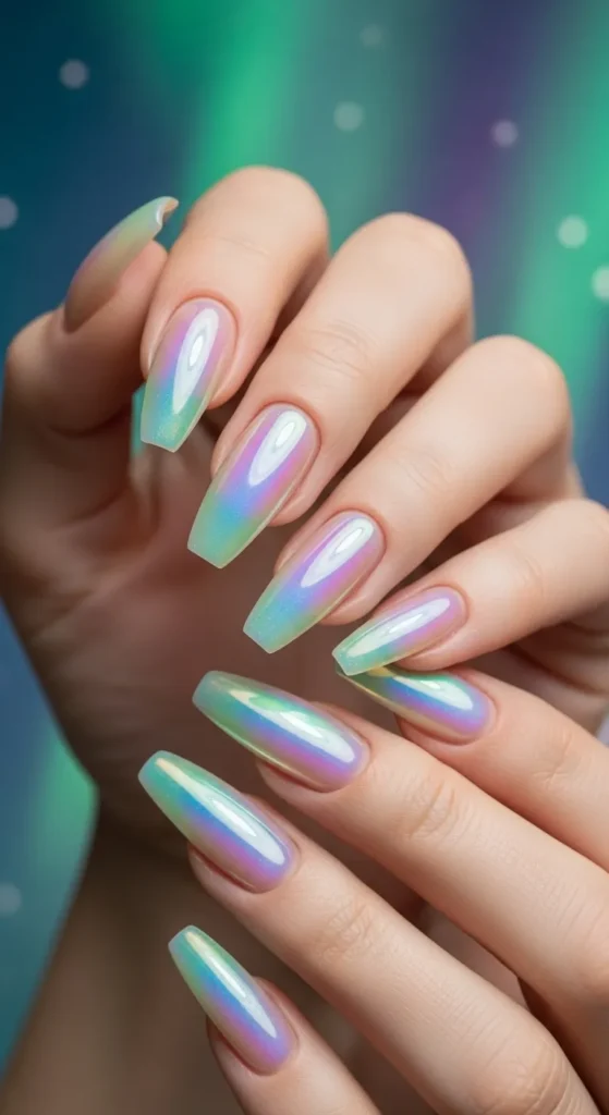 Inspired by the northern lights, these nails shimmer in hues of purple, green, and blue.