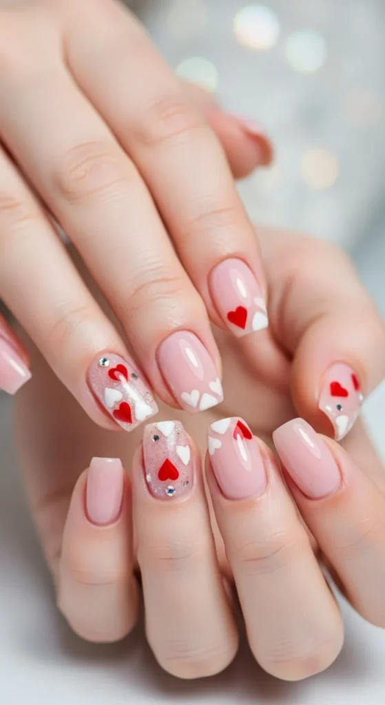 Simple yet adorable — add tiny heart designs on one or two nails for a romantic vibe.