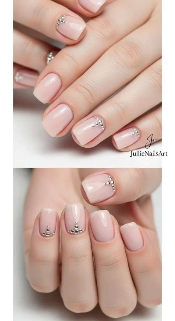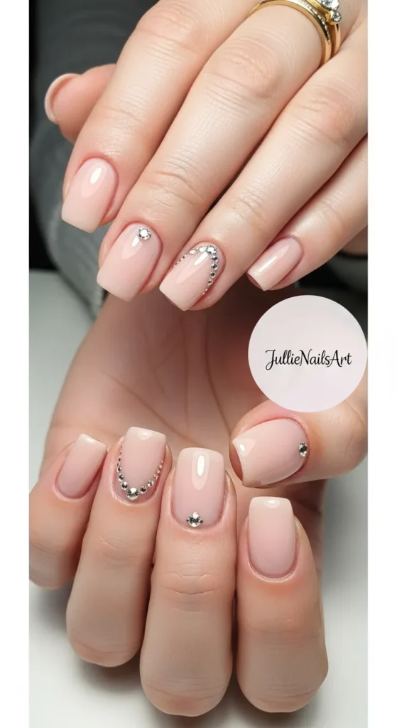 Rhinestones add a touch of sparkle and luxury to short nails. Apply small stones near the cuticle or at the nail tips for a chic, elegant finish. This short nail idea is perfect for weddings, parties, or any special occasion where you want your nails to shine beautifully.