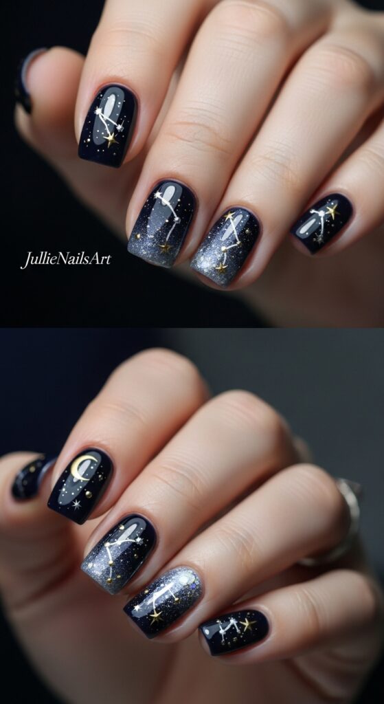 Inspired by the night sky, this design uses dark blue or black polish with tiny white and silver stars. You can add glitter for extra sparkle. This short nail idea looks magical and adds elegance with a dreamy touch.
