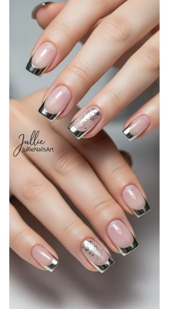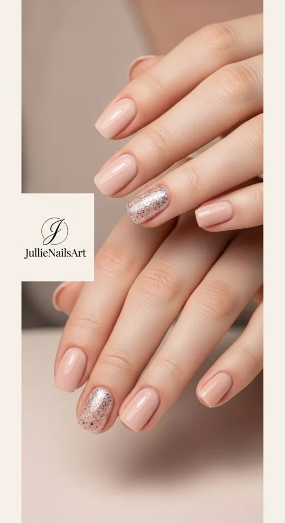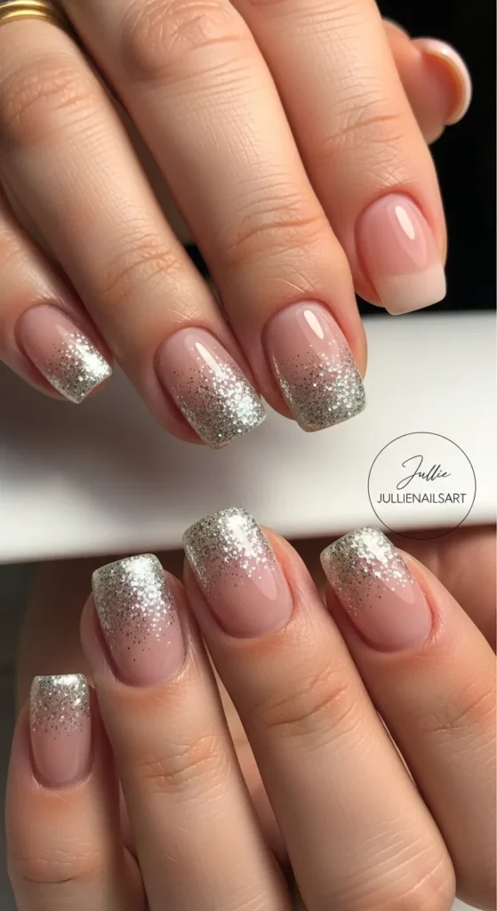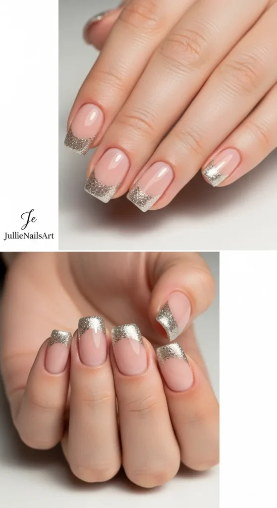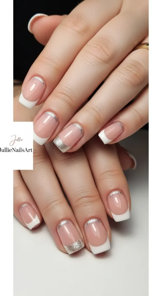 Upgrade your classic French manicure by replacing white tips with glitter polish. Silver, gold, or rose gold glitters work beautifully on a nude or pink base. It’s elegant, festive, and one of the best short nail ideas for weddings or special occasions.