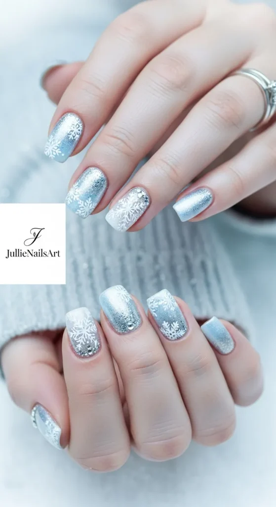 Cool tones like navy, icy blue, and silver create a frosty effect. Glitter and snowflake designs also look amazing on short nails.
