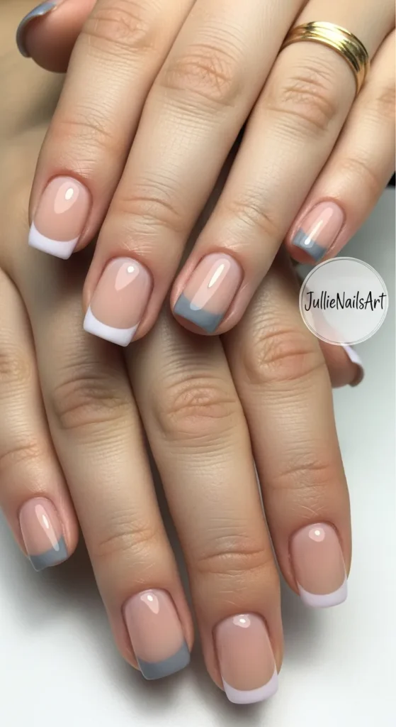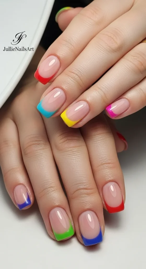 Instead of traditional white French tips, try colorful rainbow tips. Paint each nail’s tip with a different vibrant color for a fun and cheerful effect. This short nail design is playful, trendy, and perfect for those who love bold and creative looks.