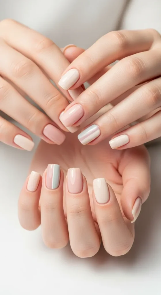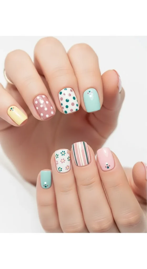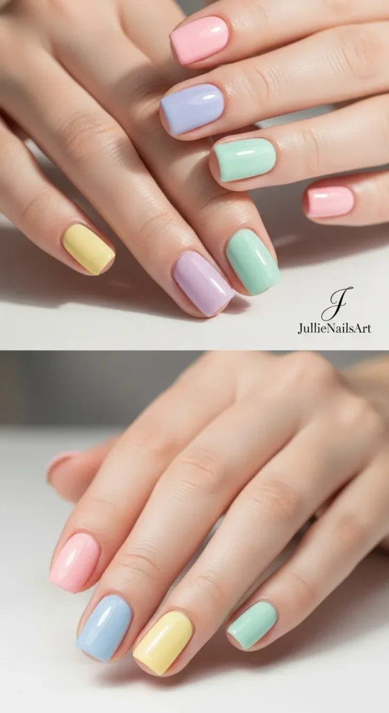 Pastel shades bring freshness to your overall look. Try painting each nail in a different pastel hue — lavender, mint green, baby blue, and peach — to create a soft rainbow effect. It’s cheerful, colorful, and perfect for spring or summer vibes.