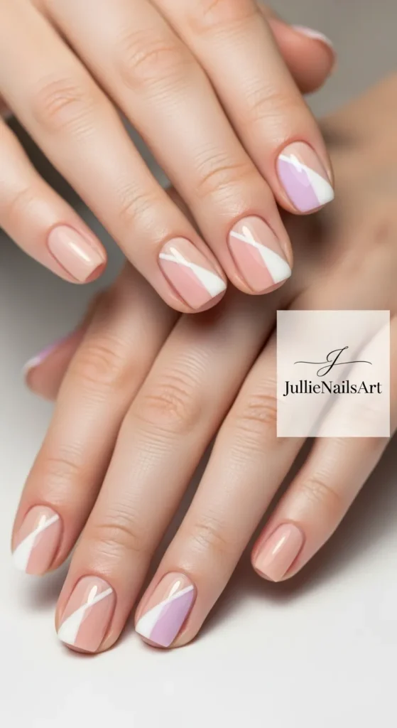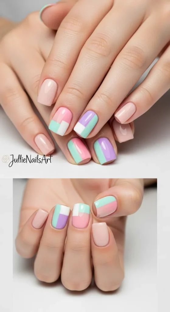 Color blocking is a bold and vibrant trend. Use two or three contrasting shades like pink, blue, and yellow in geometric sections. This short nail idea is eye-catching and perfect for those who love experimenting with modern styles.