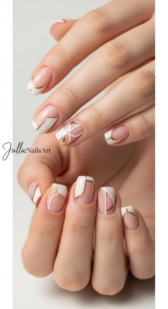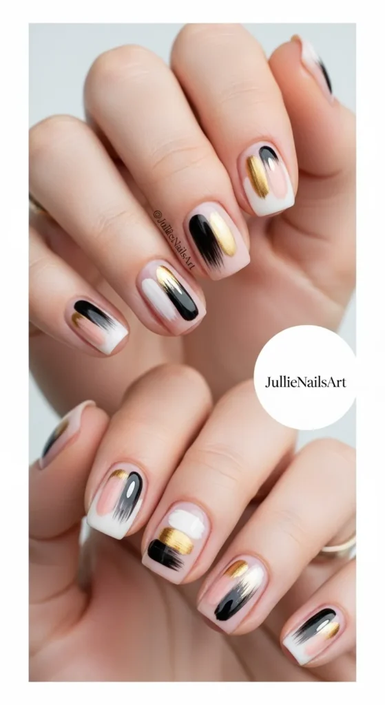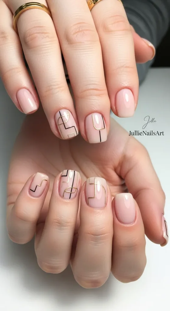 Geometric designs add a touch of modern art to your nails. Use straight lines, triangles, or tiny shapes in contrasting colors like black, gold, and nude. These patterns make your short nails look sharp, trendy, and perfectly balanced for any occasion.