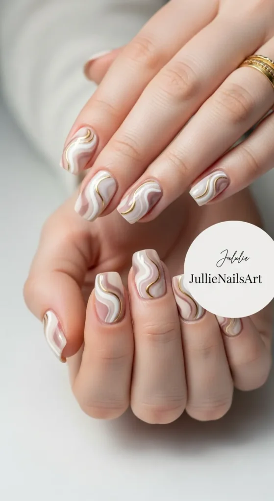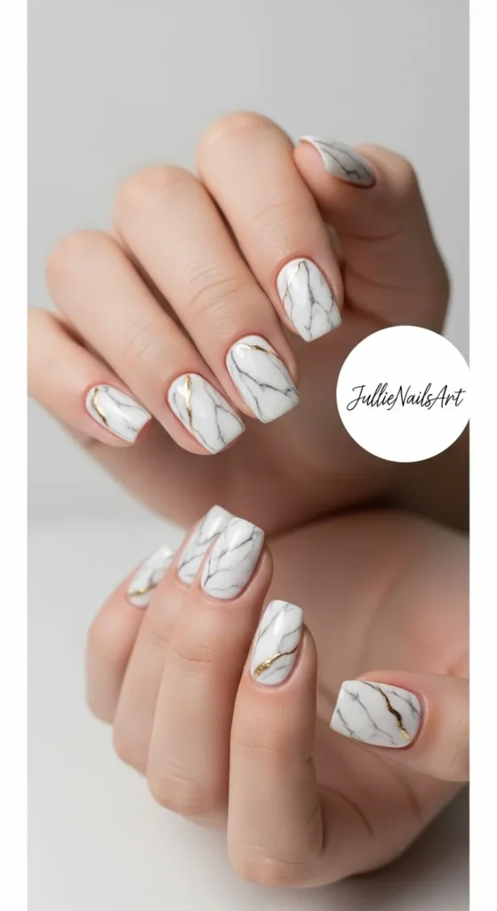 Marble nails create a luxurious appearance that looks stunning on short nails. Use a white or light-gray base with subtle veins of gold or silver. It’s one of the most elegant short nail ideas suitable for both formal and casual looks.