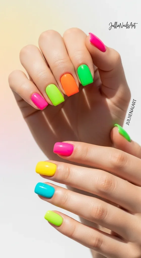 Neon colors bring bold energy to your nails. Shades like hot pink, lime green, and bright orange make short nails pop instantly. This short nail idea is perfect for summer festivals, beach days, or any occasion where you want to stand out.