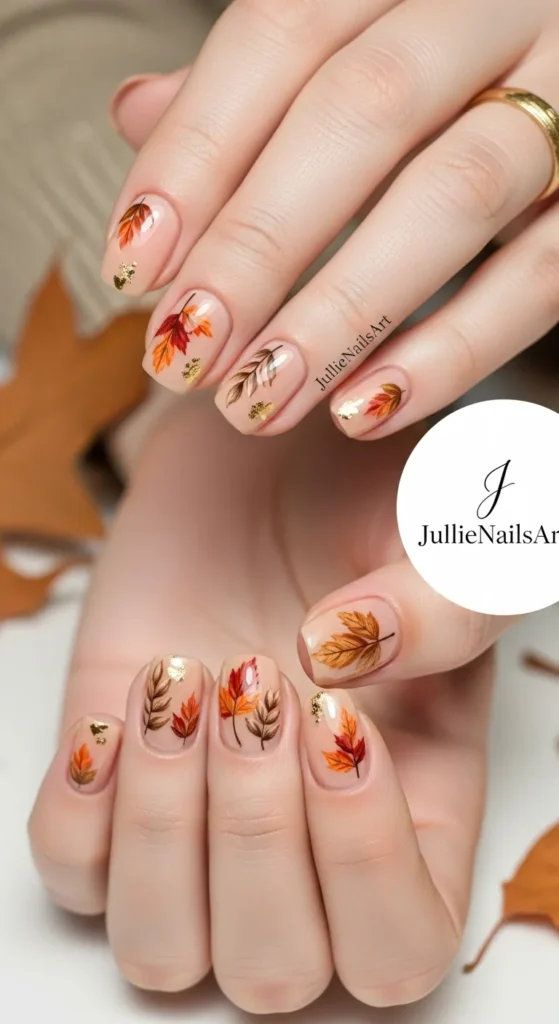 Capture fall vibes with warm tones like burnt orange, brown, and gold. Paint small leaf shapes or use decals to represent autumn foliage. This short nail design feels cozy and seasonal — great for the autumn months.