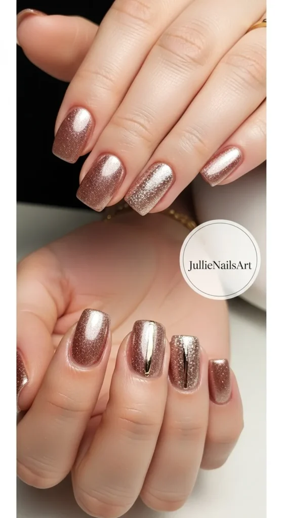 Rose gold shimmer gives your short nails a soft, romantic glow. It’s not too flashy but still catches the light beautifully. This short nail design is ideal for weddings, dates, or any elegant occasion.