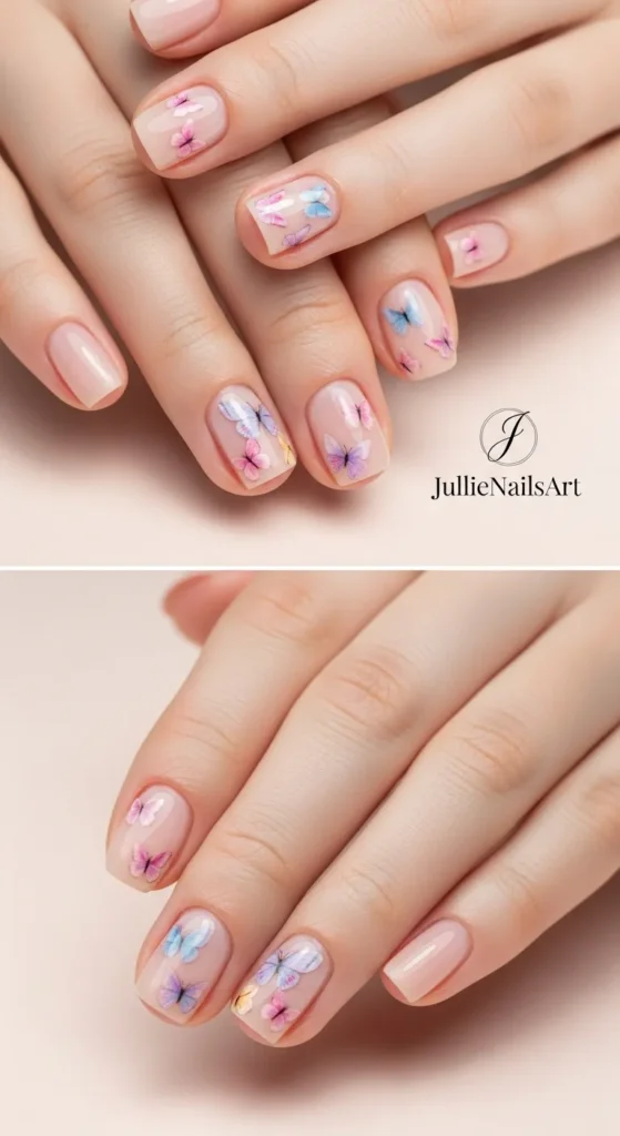 Butterflies symbolize beauty and transformation, making them a great choice for nail art. You can add small butterfly stickers or paint delicate wings using pastel shades. This short nail design gives a dreamy, elegant feel perfect for spring and summer.