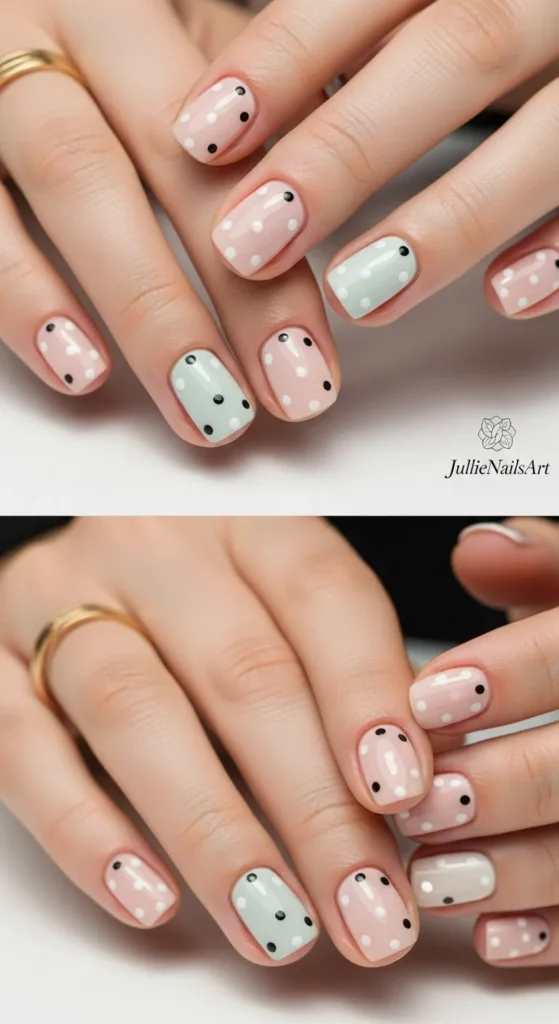 Playful and easy to create, polka dots can make short nails look stylish and fun. Use a dotting tool or a toothpick to add small dots in contrasting colors. You can even try pastel dots on white for a cheerful summer look.
