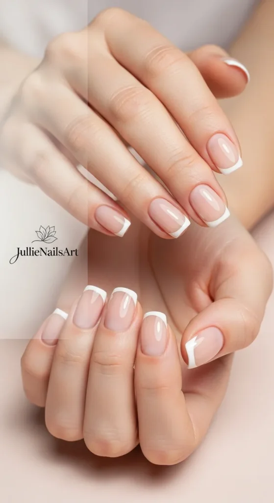 The French manicure is timeless and classy. For short nails, a thin white tip with a soft pink or nude base creates a natural and refined look. You can also experiment with colorful or metallic tips to add a modern touch to your classic short nail design.