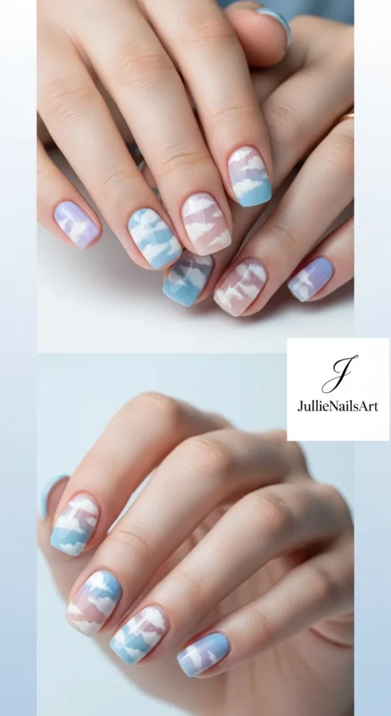 Soft, dreamy clouds painted over a light blue or pastel background create a calming and artistic look. This short nail idea feels relaxing and is ideal for spring and summer. Add tiny sparkles or stars for a celestial touch that enhances the design’s beauty.