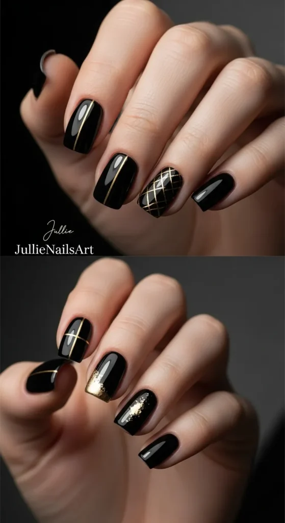 Black and gold together create a stunning, luxurious effect. Use gold stripes, dots, or foil over a black base for a dramatic and elegant finish. This short nail idea looks great for evening events or parties and adds sophistication to your look.