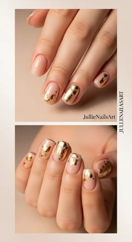 Add luxury to your nails with a touch of gold foil. Apply small gold flakes randomly over a nude or white base for an elegant shimmer. This short nail design is perfect for weddings, parties, or any special occasion where you want to stand out.