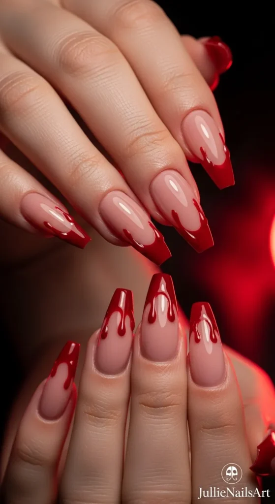 Classic horror-inspired look! Paint your nails nude or white and add realistic red “blood drips” using polish or gel.