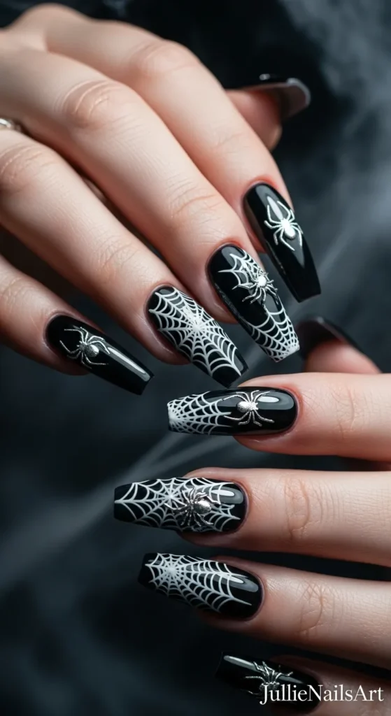 Draw delicate black spider webs on a matte grey or silver background for a subtle spooky vibe.