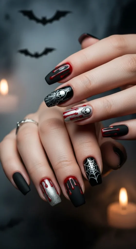 Add metallic chains, spikes, or silver foils over black polish for a bold, industrial horror look.